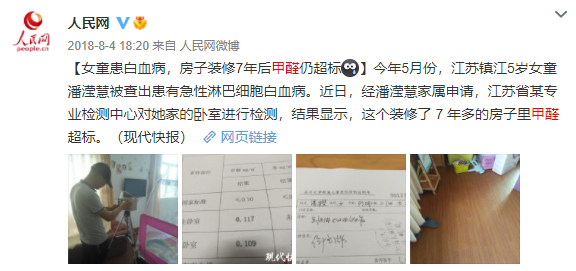 有研究证实,建造新房和装饰新居所用的砖、石、水泥、钢筋、木材、胶合板、塑料、油漆、涂料、瓷器和新家具中都含有一定量的对人体有害的物质,而甲醛则是室内家装污染的主犯!长期生活在甲醛超标的环境下,可能会引起呼吸道、皮肤和消化道的疾病,也会对免疫系统造成影响。人民网曾经就有报道过5岁小女孩患上白血病,经过检查最后发现,7年老房甲醛仍超标。